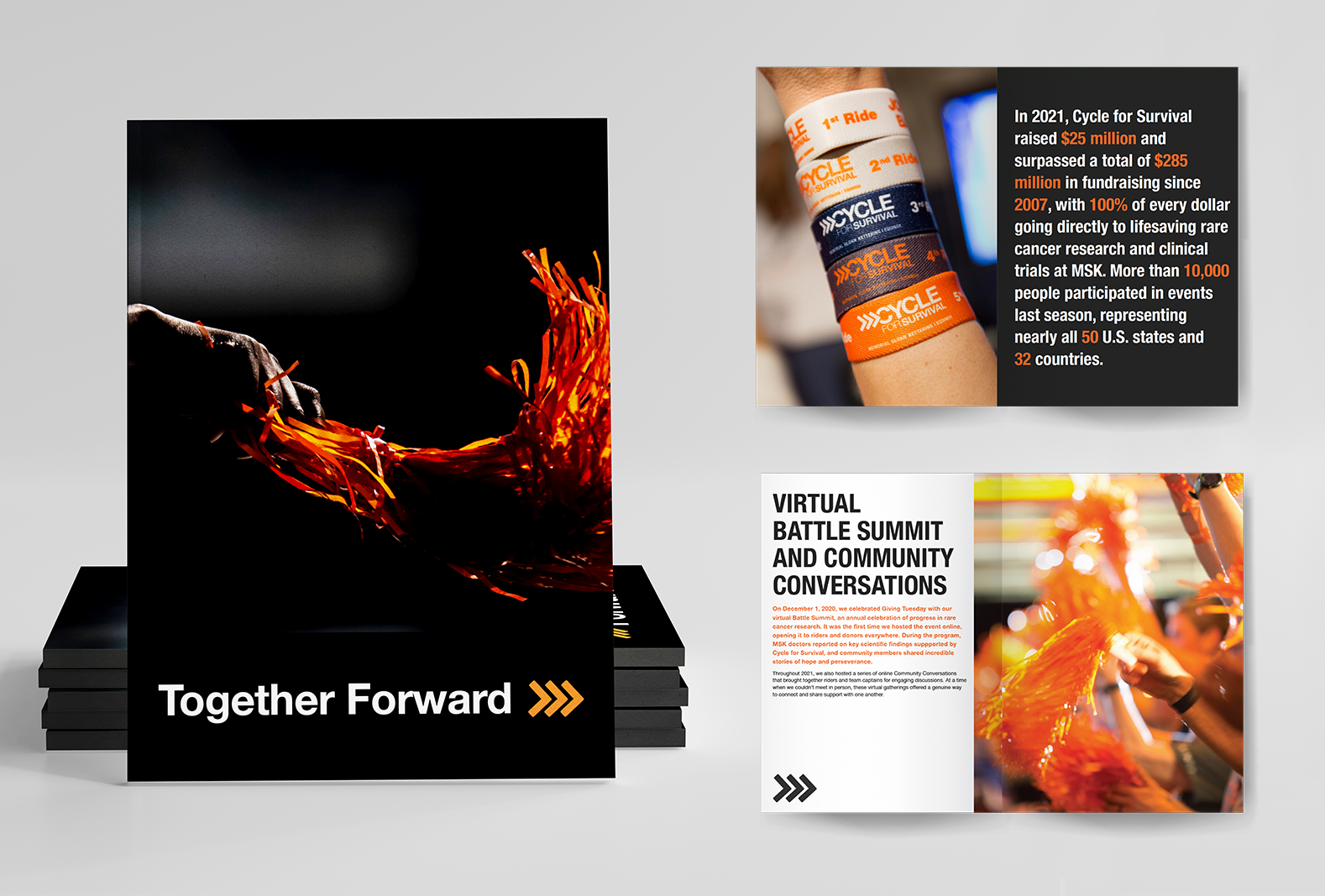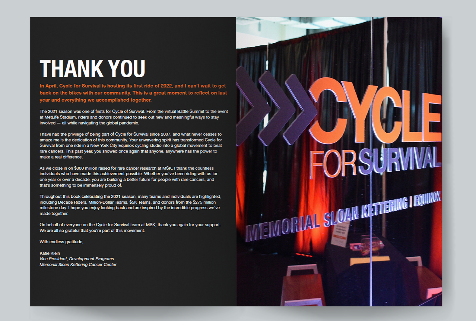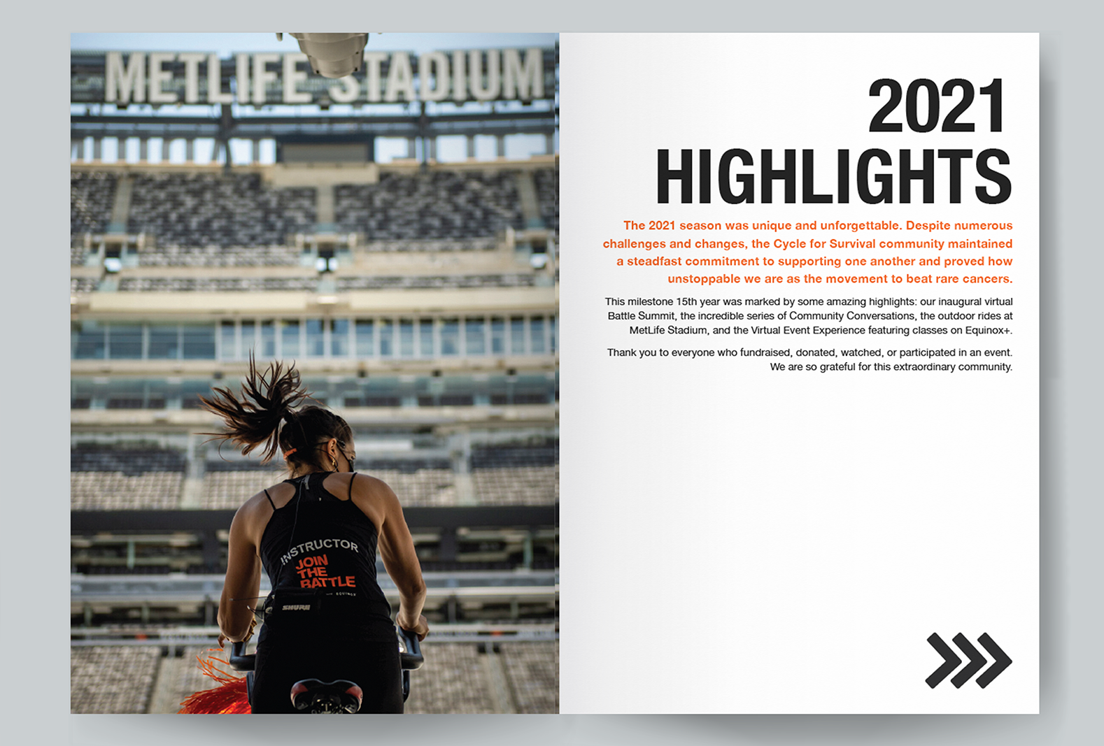 This commemorative book was written and designed to thank Cycle for Survival participants for 15 years of riding and fundraising for the cure to rare cancers. By designing this book, I was awarded a Graphic Design USA Award for Health and Wellness design for 2022.